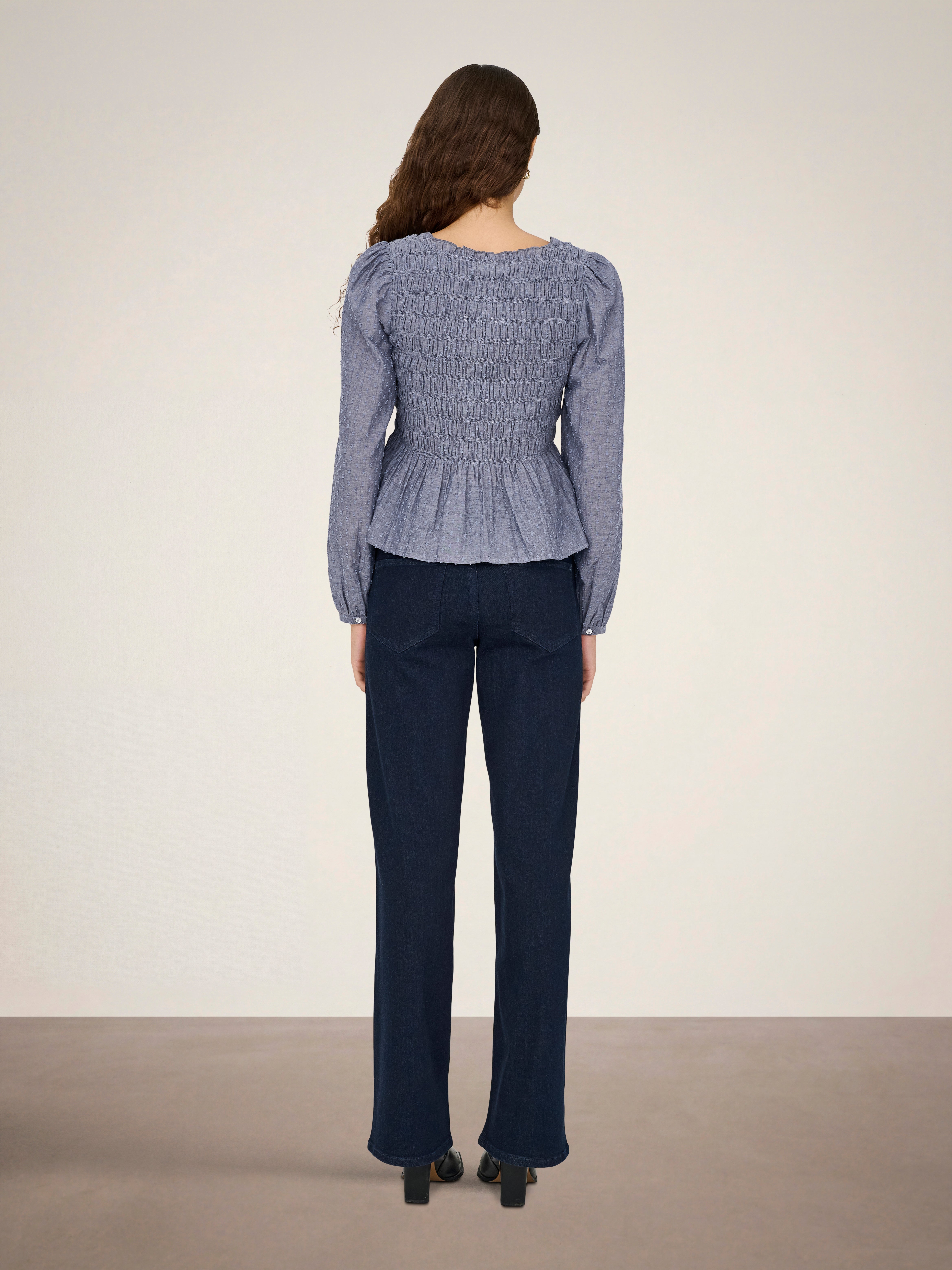 Change your everyday outfit in a second by adding a feminine top for a soft, clean expression.