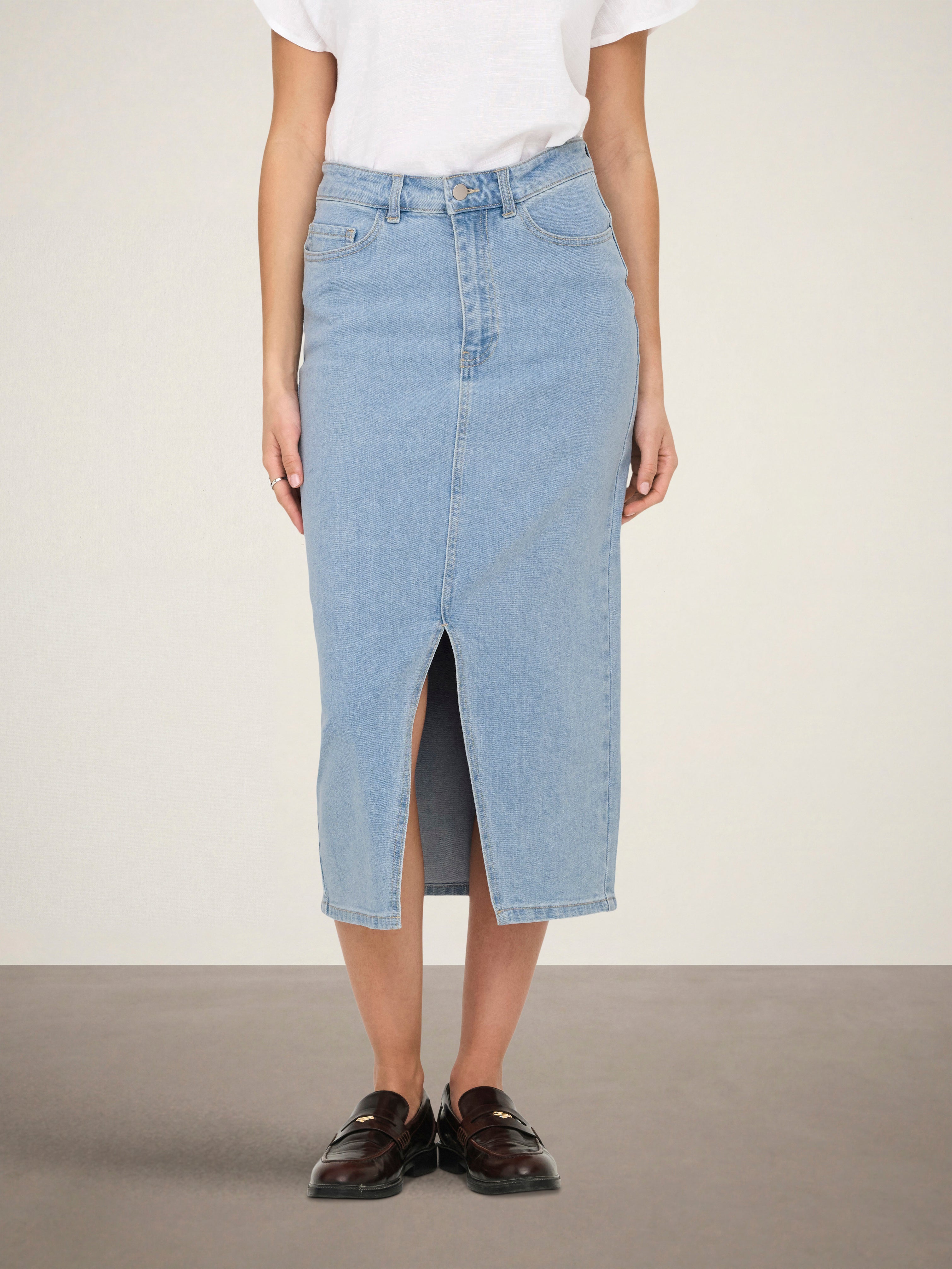 Vratite klasik u svoj ormar s traper suknjom, savršeno usklađenom s omiljenim topom i parom tenisica.