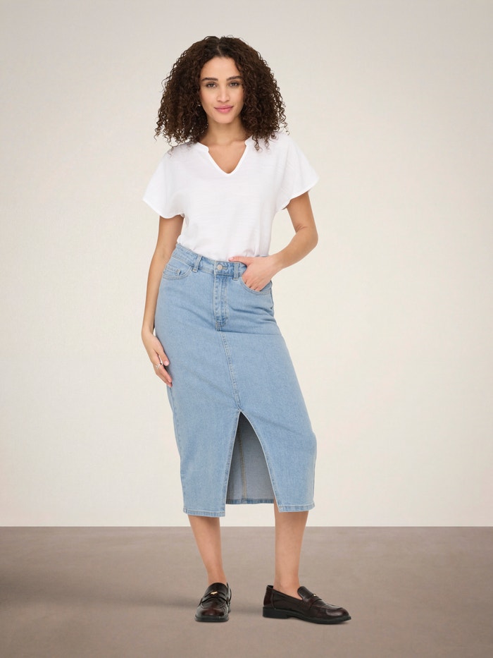 Torna alle radici del classico con una gonna in denim, perfetta da indossare con il tuo top preferito e un paio di scarpe da ginnastica.