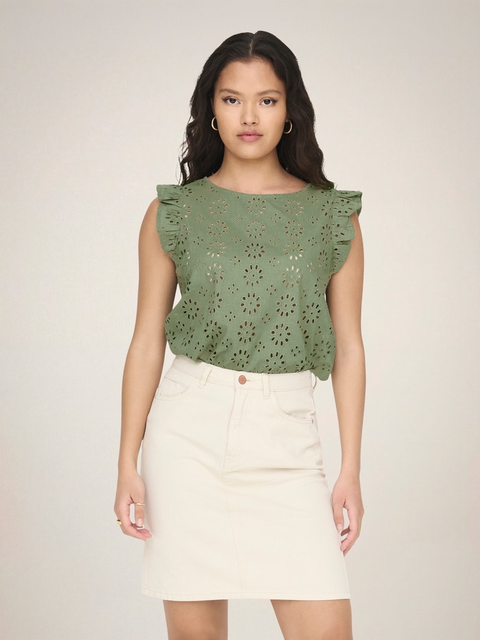 Broderie Anglaise išsiskiria iškirpimais ir siuvinėjimais, sukuriančiais gražią nėriniuotą išvaizdą .
