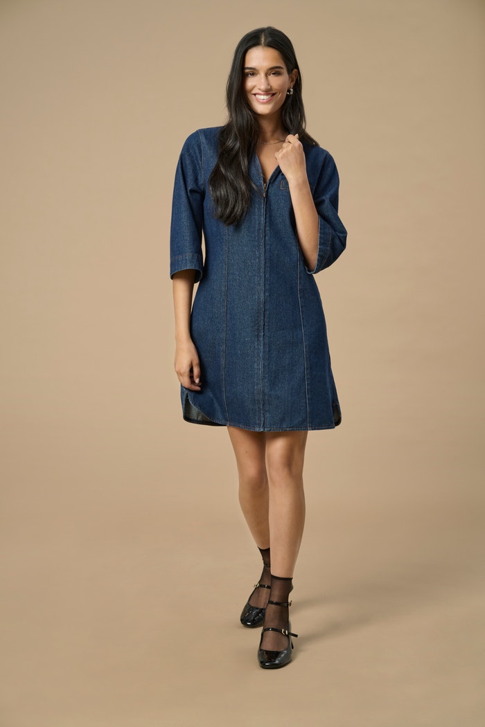 Būkite ramūs su džinsine suknele, puikiai derinama su treniruokliais ir lengva striuke vasarai arba su pėdkelnėmis, auliniais batais ir mezginiu, kad atrodytų švariai žiemiškai.