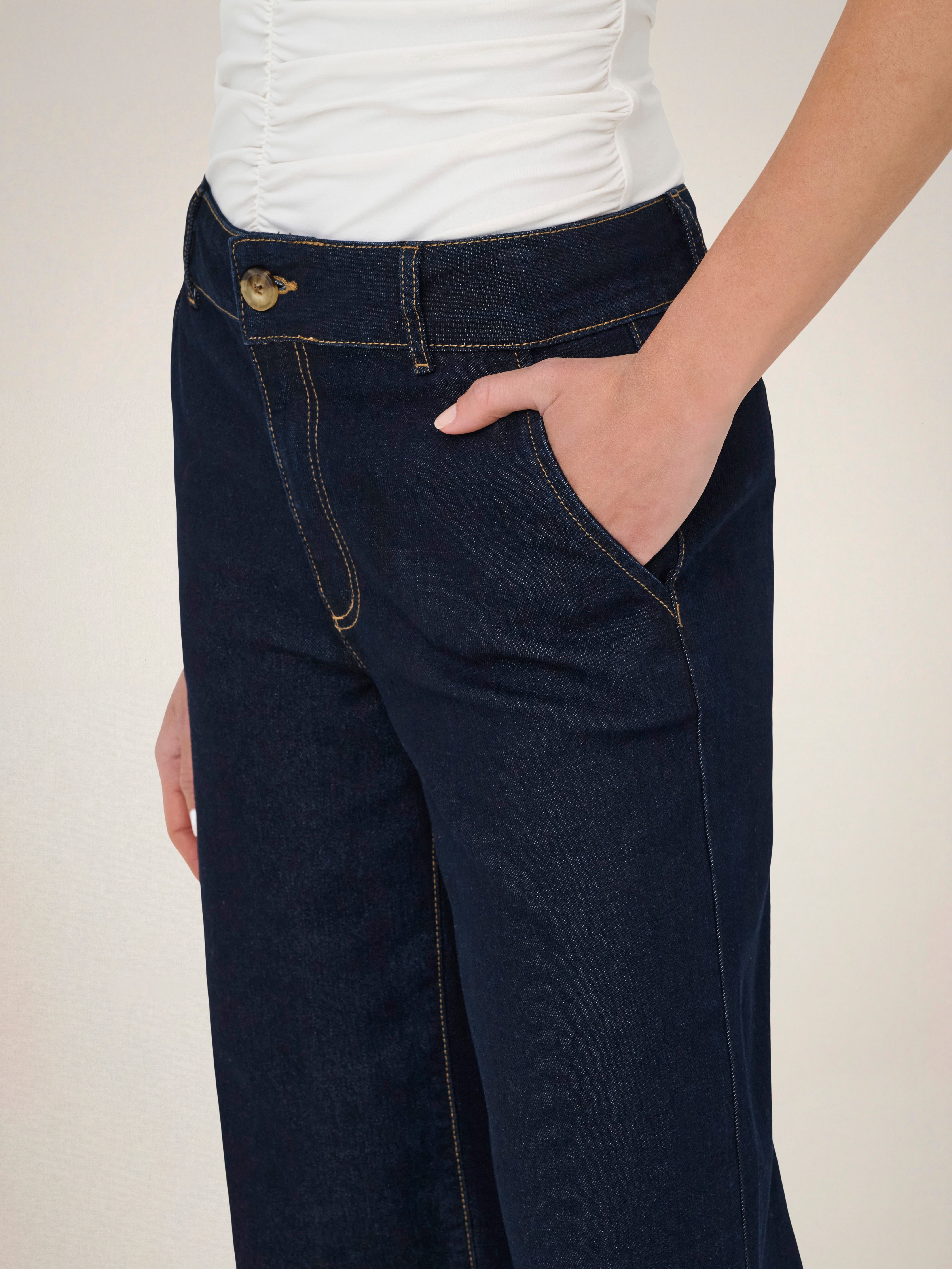 - Passform : Denne stylen med vide ben er designet med fokus på komfort, med god plass fra hofte til ankel