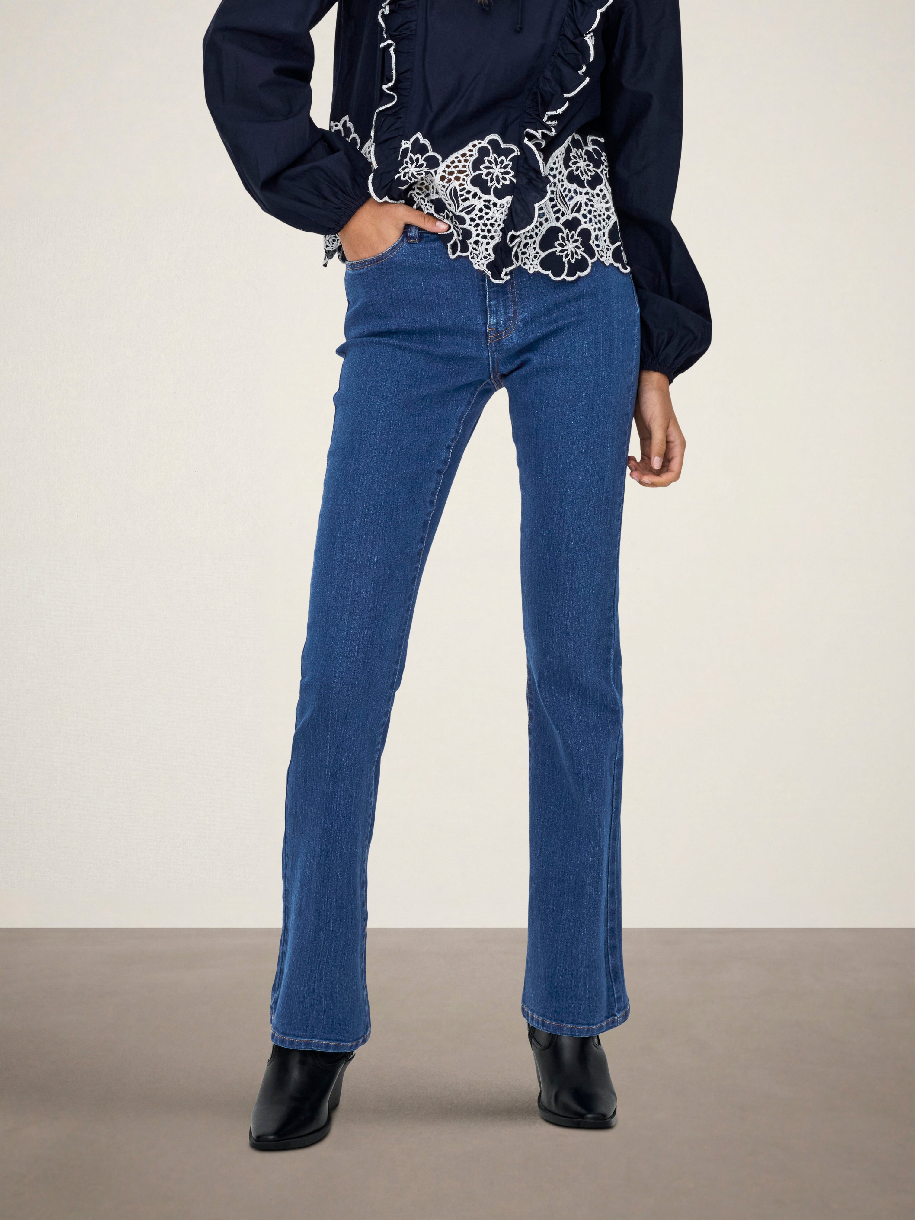 - Pasvorm : Deze flared fit jeans omhelst je heupen en dijen en loopt vanaf de knie wijder uit