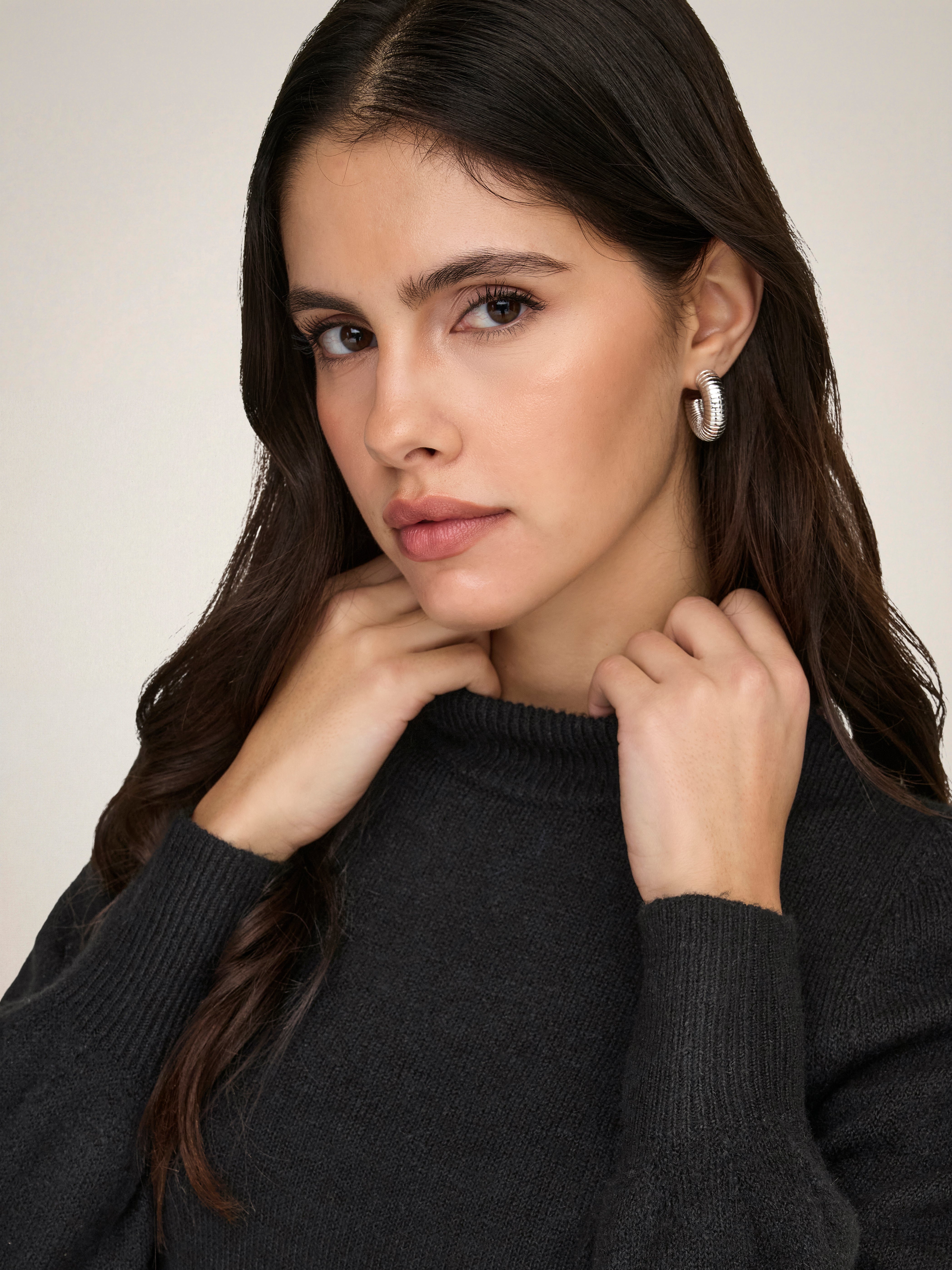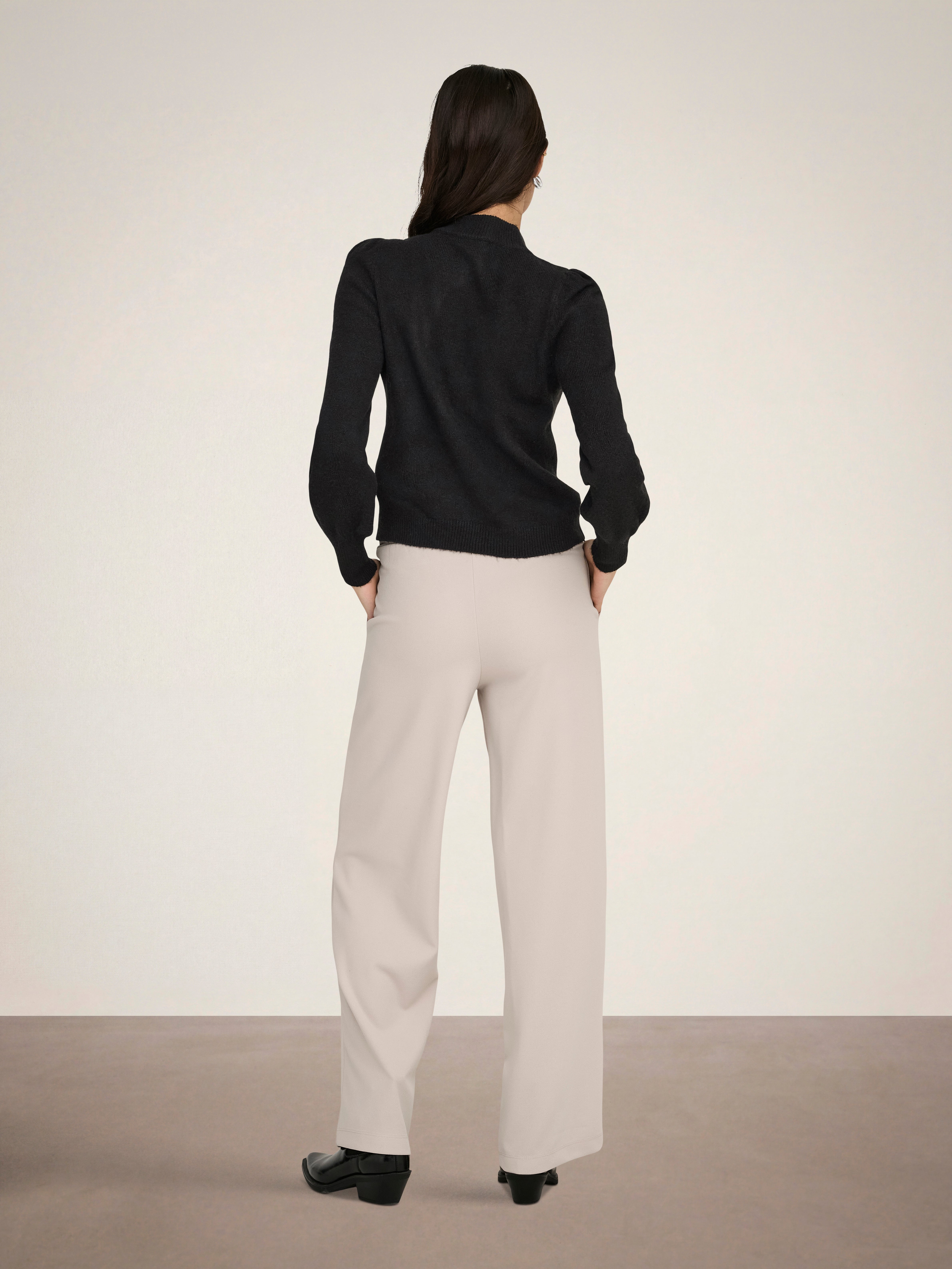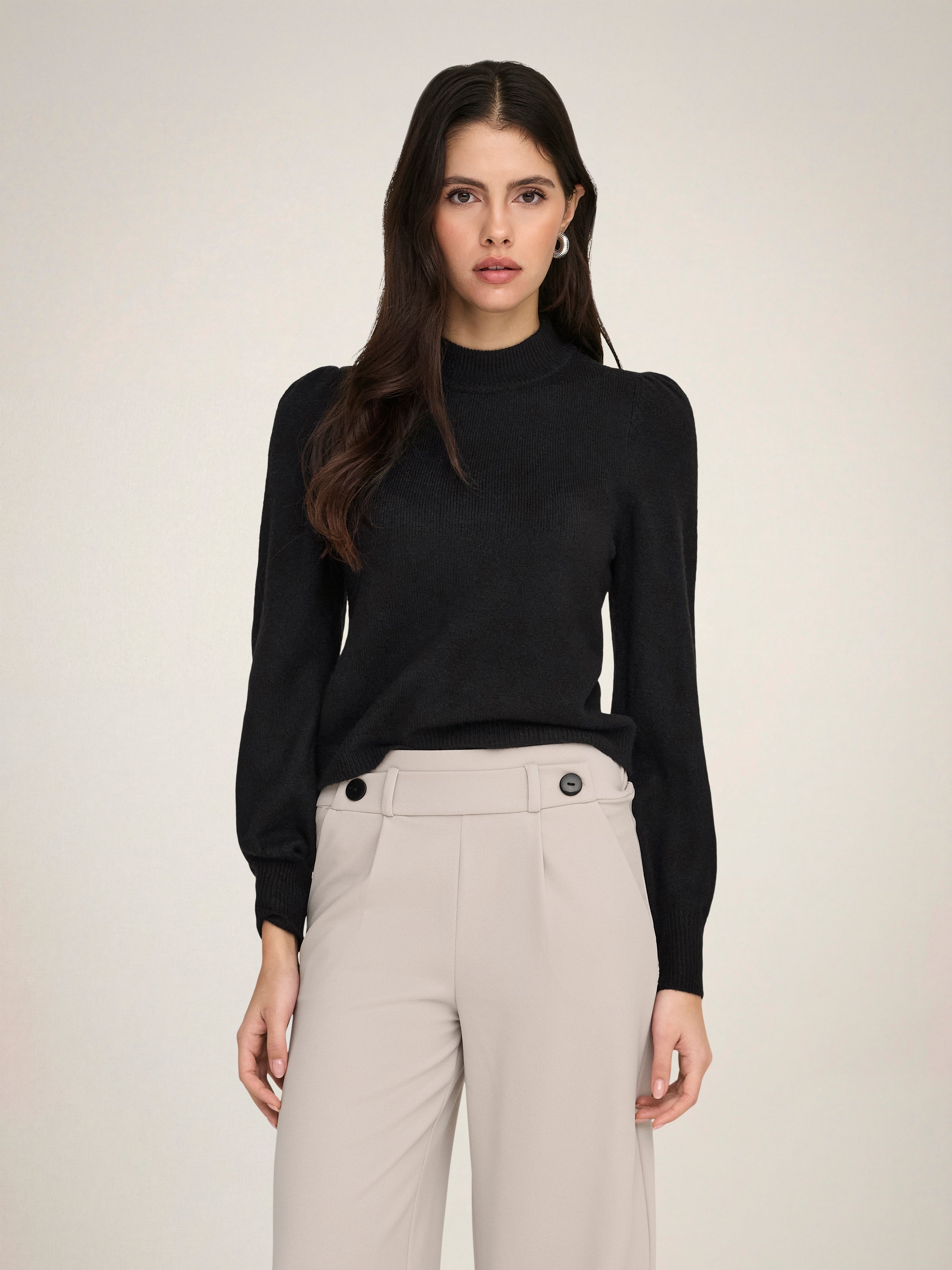 Maak je look helemaal af met een tijdloze gebreide trui voor extra zachtheid en warmte.