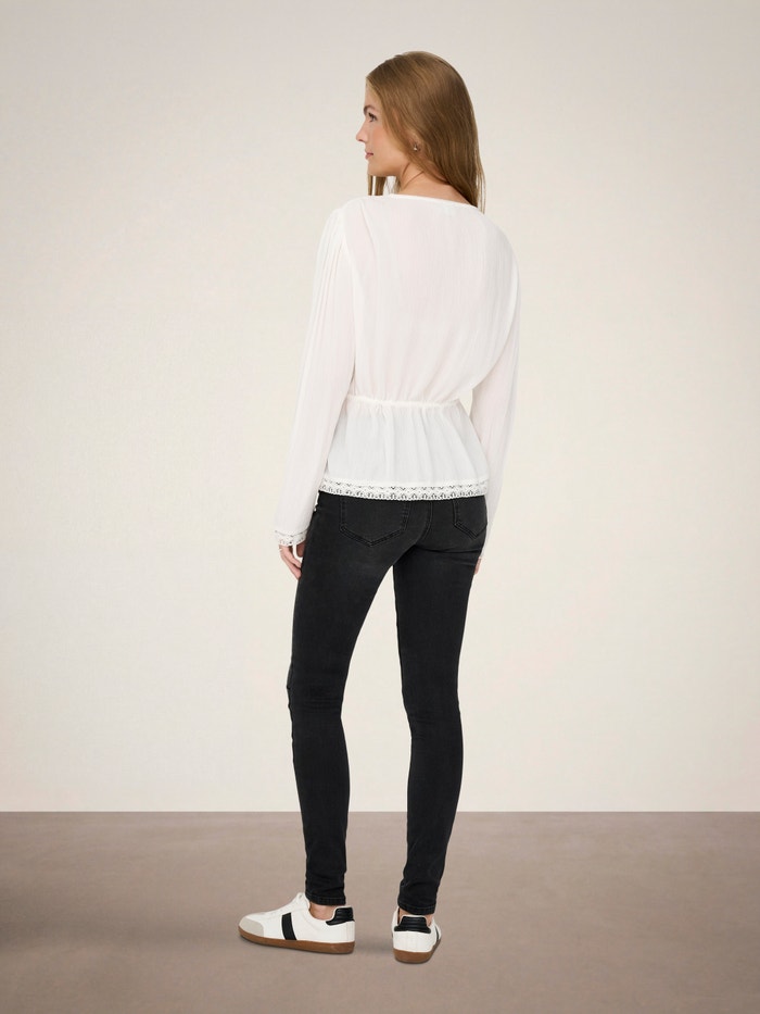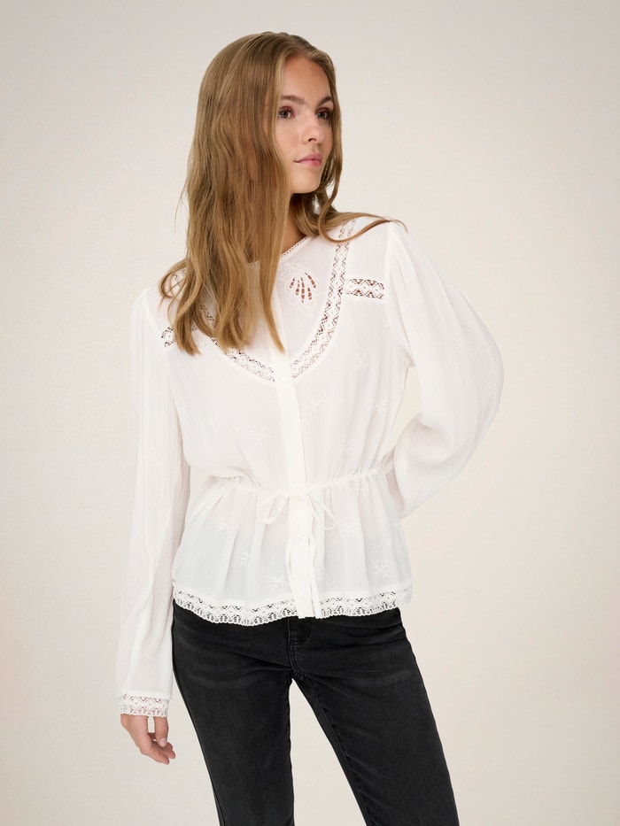 Mude a sua roupa do dia a dia num segundo, adicionando um top feminino para uma aparência suave e requintada.